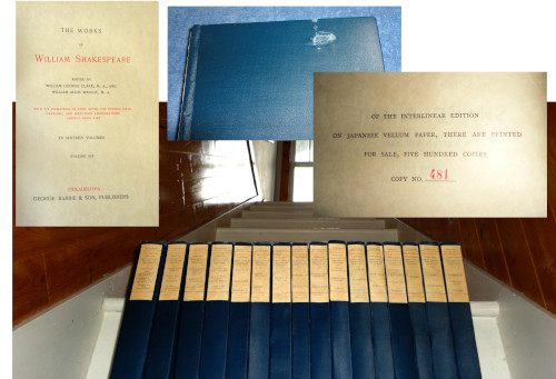 17257 Shakespeare, William, The Works of William Shakespeare, Edited By William George Clark and William Aldis Wright, in 16 Volumes George Barrie & Son Circa 1899 Good condition. Volume 10 has a 1 inch gouge on the front cover. Light shelf wear and soiling. This set is copy # 481 of 500 printed on Japanese Vellum Paper, bound in dark blue cloth "silk? "...with 171 engravings on steel after the Boydell Illustrations; and sixty-four photogravures Chiefly from life" The Interlinear edition. Literature, limited editions $300