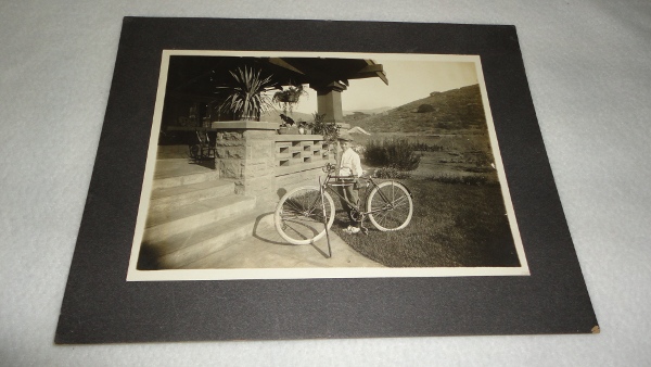 12319 Black and White Photo of a Boy and his Bicycle unknown Circa early 1900s Very good. A 5 x 7 photo mounted on a 7 x 9 board of a boy with his bicycle and gun? Probably in eastern Washington State. (aaap) ephemera, Bicycle, Pacific Northwest, Washington State $20