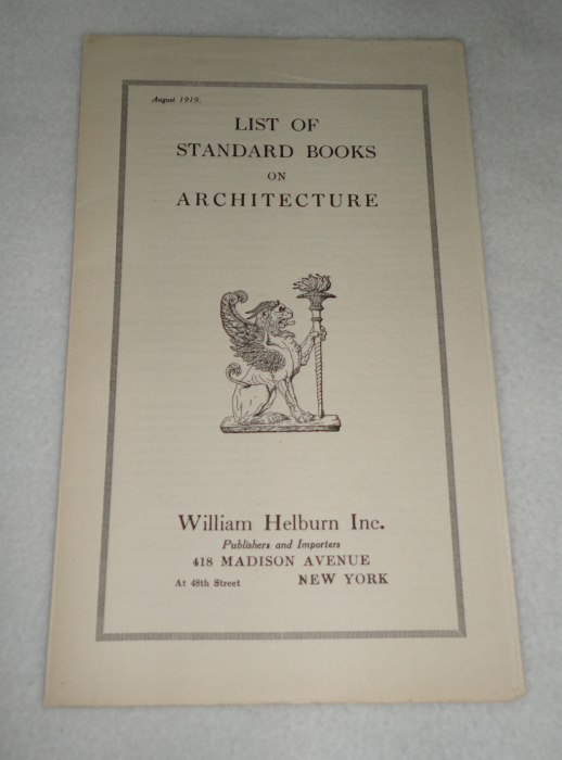 | 12126 | Helburn, William | List Of Standard Books On Architecture | William Helburn Inc. | Very good. | 5.5 x 9 inches, 22 inches when folded out, 7 pages of books on architecture in 1919. | Bibliophile, book collection, Architecture, book catalogue | $20 |