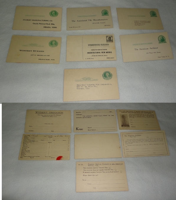 | 12438 | Multiple | Seven Architecture Related Business Postcards Circa 1920s | Self Published | Good | The American Architect, a subscription solicitation, Charles Scribner's sons Archicture subscription solicitation, South-Western Architectural Iron Works, Chicago, The Associated Tile Manufacturers, Beaver Falls, Penna., Western Builder, Milwaukee, Wis., MacArthur Concrete Pile Corporation, Chicago, and Sturges Manufacturing Co., Omaha, (Fire Escapes) | Ephemera, Architecture, philately | $20 |