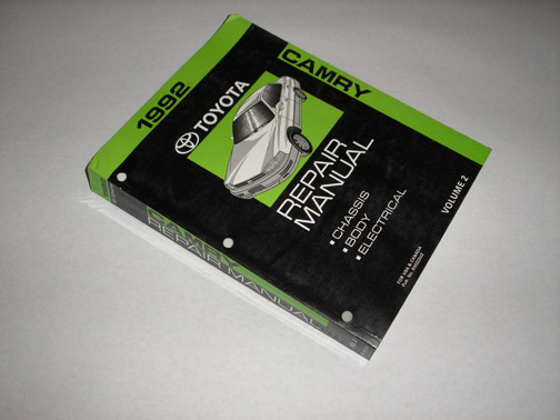 | 11005 | Toyota Motor Corporation | 1992 Toyota Camry Repair Manual Chassis Body Electrical Volume 2 | Toyota | Good. There's a crease on the top front of the cover, both covers and spine have shelf wear. The contents are very good. | 1992 paperback, 8.5 x 11 inches, with many pages. ISBN 0493011902 | Toyota, Toyota Camray, repair manual, automotive | $25 |