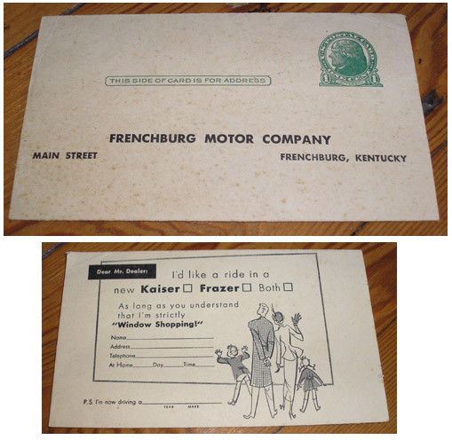 | 11778 | Kaiser Frazer | Kaiser Frazer | Kaiser Frazer Postcard | Good. Slight soiling, one corner has a small crease and the front has brown spotting. | 3.25 x 5.5 inch uncirculated postcard from the Frenchburg Motor Company in Frenchburg, Kentucky, for Kaiser and Frazer cars. | Automotive, Kaiser, Frazer, Frenchburg Motor Company, ephemera | $20 |