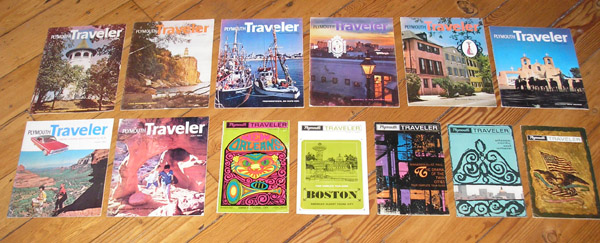 | 11794 | Swanson, Ralph N. and James Ward | Plymouth Traveler, thirteen issues from 1962 to 1964 | Chrysler Motors Corporation | Good. Most have some light shelfwear, rusty staples and soiling. There's ocassional tearing along the spine and light moisture "waves," scrape marks and an address label. | The 1962 issues are 8.5 x 11 inches. May, June, August-September, November and December. The three 1964 issues are 8.25 x 10 inches --July, October and November. The 1966 issues are 6 x 9.25 inches. All have interesting travel articles and ads for Plymouths of the era. | Automotive, Plymouth, Plymouth Traveler, Chrysler Corporation | $30 |