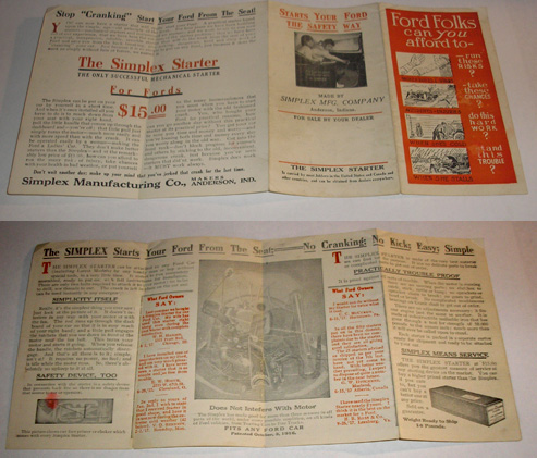 | 11803 | Simplex Mfg. Company, Anderson, Indiana. | Start Your Ford The Safety Way The Simplex Starter | Simplex Mfg. Company | Good. Light wear, soiling and creasing. | 13 x 6 inch multiple fold brochure on the Simplex Starter for Model T Fords. | Automotive, automotive literature, Ford, Model T, Simplex Starter, ephemera. | $20 |