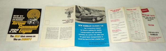 | 12308 | American Motors | Rambler Car literature | American Motors | Good. Faintly musty. | Three pieces of American Motors literature. One is "Confidential important Facts Every new car Buyer Should Know About Falcon," comparing the Falcon to the Rambler, a stiff cardboard sheet about the 232 Torque Command Engine, and a brochure for the Rambler Classic V-8. | Automotive, American Motors, Rambler, ephemera | $20 |