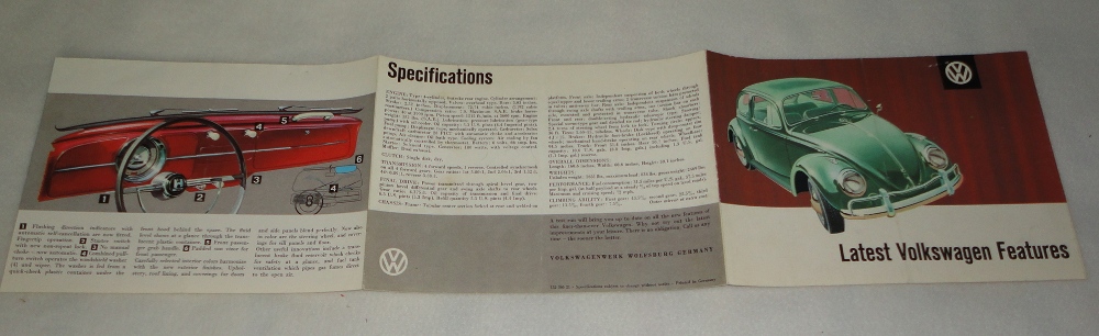 | 12350 | Volkswagen | Latest Volkswagen Features | Volkswagen | Good. There are staple marks on the front cover. Light soiling. There's a fairly sharp vertical crease effecting all pages. | 24.5 x 6 inch 3 fold brochure for Volkswagen. There are color and b&w photos and a list of specifications. | Automotive, Volkswagen, ephemera | $20 |