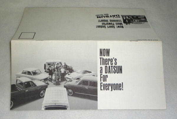 | 12355 | Datsun | Now There's a Datsun For Everyone! | Datsun/Nissan | Very good. | This b&w 4 x 9 inch brochure covers the SPL-311, the PL411, the L-520 pickup and more. | Automotive, Nissan, Datsun, ephemera | $20 |