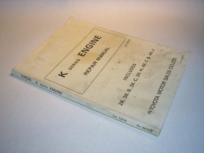 | 12534 | Toyota Motor Sales Co. | K Series Engine Repair Manual | Toyota Motor Sales | Fair to good. Faded cover, grease stains and pen marks. | 7.25 x 10.25, a repair manual for the Toyota K Series Engine. There are many b&w photos and illustrations | Automotive, Toyota, K Series Engine | $20 |