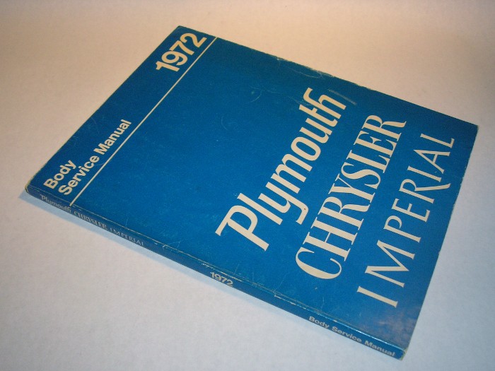 | 12535 | Chrysler Corporation | Body Service Manual 1972 Plymouth Chrysler Imperial | Chrysler Corporation | Good. Light shelf wear. | 8.5 x 11 inches with many illustrations, tables and diagrams for all Chrysler corporation cars. | Automotive, Chrysler Corporation | $25 |