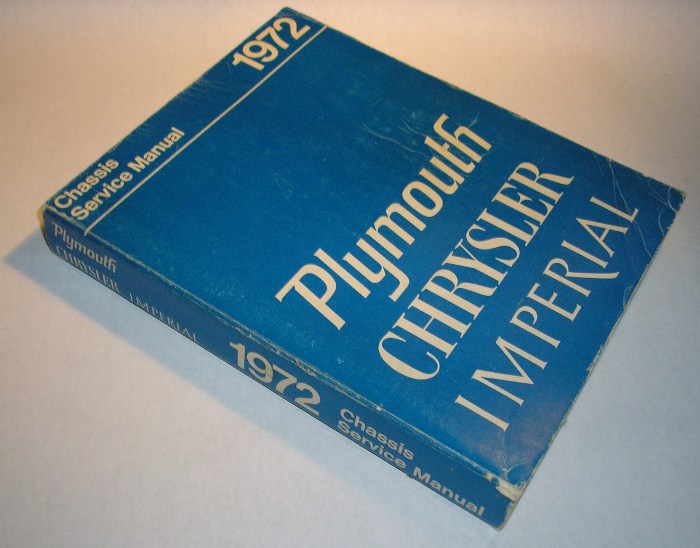 | 12536 | Chrysler Corporation | Chassis Service Manual 1972 Plymouth Chrysler Imperial | Chrysler Corporation | Fair to good. Covers have wear and creasing. Some light soiling on the pages. | 8.5 x 11 inches with many illustrations, tables and diagrams for all Chrysler corporation cars. | Automotive, Chrysler Corporation | $50 |