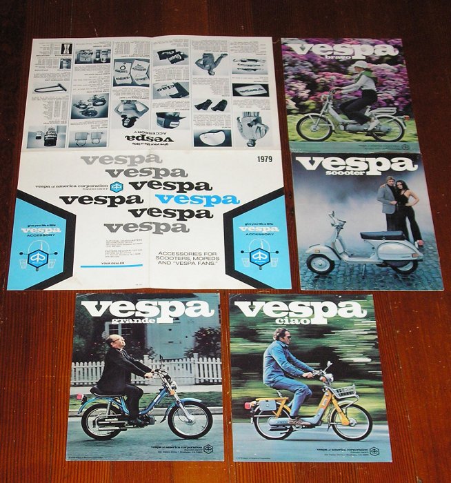 | 12695 | Vespa of America | 1979 Vespa Scooter Literature, five pieces | Vespa Of America | Good. Light shelf wear, occasional stains, soiling and creasing. | 17 x 22 inches multiple fold brochure for Vespa Scooters. 4 page 8.5 x 11 general brochure for models 50 special, P125X and P200E. 8.5 x 11 double sided brochures for the Bravo, Grande and Ciao. Mopeds. | Vespa Scooters, Automotive, Mopeds | $30 |