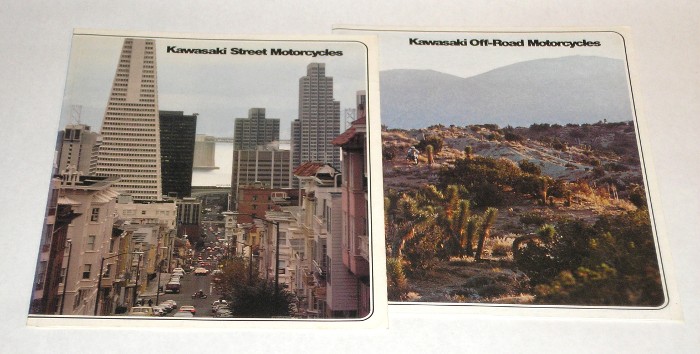 | 12811 | Kawasaki Motors Corp. | Kawasaki Motorcycle Literature, 1978 | Kawasaki Motors Corp | Good. Light shelf wear. | Kawasaki Motorcycle Literature from 1978, two pieces. Kawasaki Off-Road motorcycles, 2 fold, 17 x 22 inches, both sides, with 6 bikes represented. Kawasaki Street Motorcycles, 3 fold, 25 x 22 inches, both sides, with 11 bikes featured. | Kawasaki Motor Cycles, Automotive, ephemera, advertising literature. | $25 |