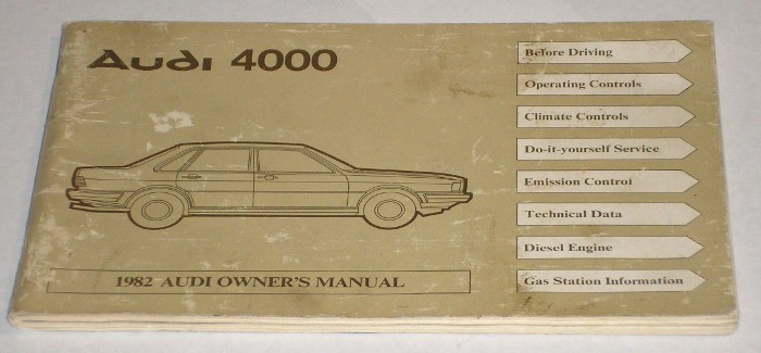| 12843 | Audi | 1982 Audi 4000 Owner's Manual | Audi | Fair to good. The covers have wear and soiling. Page edges are lightly soiled. | 8.5 x 5.25 inches with photos and illustrations and an index. This edition came with the optional diesel engine. The warrenty section is crossed out and there's an insert instead. | Automotive, Audi 4000, diesel | $25 |