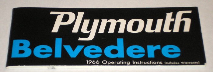 | 13146 | Chrysler Motors | Plymouth Belvedere 1966 Operating Instructions | Chrysler Motors | Very good. Small bump on the bottom edges of this original manual. | 9 x 4 inches, the original glove-box manual for a 1966 Plymouth Belvedere | Automotive, Plymouth Belvedere | $20 |