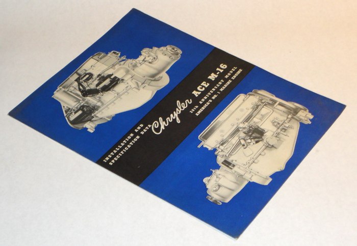 | 13446 | Chrysler Marine Engine Division | Chrysler Ace M-16 20th Anniversary Model America's No. 1 Marine Engine | Chrysler Marine Engine | Very good. Faint soiling. | 8.5 x 11 inches, 2 fold literature on the Chrysler Ace M-16 6 Cyclinder Flat Head engine with 7 line drawings with measurements and other information. | Chrysler Ace M-16, Automotive, marine engines, ephemera | $20 |