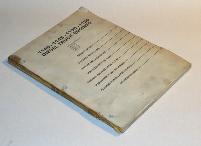 | 13448 | Caterpillar | CAT Service Manual 1140 - 1145 - 1150 - 1160 - Diesel Truck Engines | Caterpillar | Fair. Missing front cover. Soiling and creasing on the back cover. Light soiling on page edges. Contents are complete and in good condition. | 8.5 x 11 inches, a service manual with many b&w photos and illustrations for 1140, 1145, 1150, and 1160 diesel truck engines serial numbers 36b1-up, 95b1-up, 96b1-up and 97b1-up. | Caterpillar, Automotive, service manual | $30 |