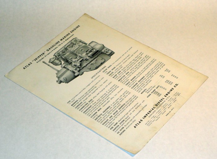 | 13457 | Atlas Imperial Diesel Engine Co. | Atlas "Skipper" Gasoline Marine Engine | Atlas Imperial Diesel Engine Co. | Good. Light soiling. | 8.5 x 11 inches, a brochure for the Atlas Skipper Engine for 1947 with a photo and specifications. | Automotive, Atlas Imperial Diesel Company, Marine Engine, ephemera | $20 |