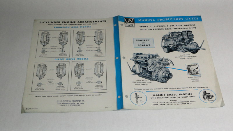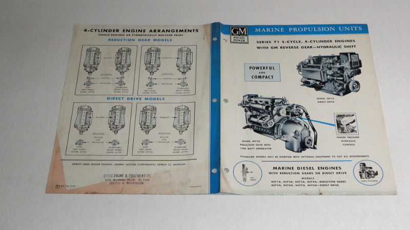 | 14241 | General Motors | GM Diesel Power Marine Propulsion Units Series 71 2-cycle, 3-Cylinder Engines | General Motors | Good. Light soiling and creasing. A small bit of ink writing, business rubber stamp on the back. | 8.5 x 11 inches with pictures, specifications,installation dimensions and more. | Automotive, GM Diesel, Detroit Diesel, ephemera. | $20 |