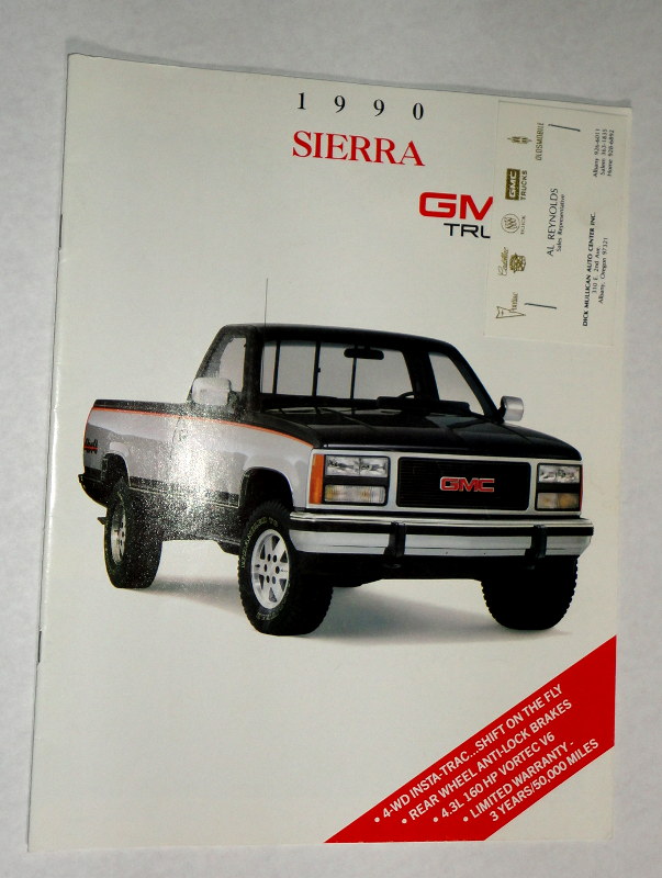 | 14338 | General Motors | 1990 Sierra GMC Truck Literature | General Motors | Good. Salesman's business card stapled to the front cover. | 8.5 x 11 inch literature for the 1990 GMC Sierra Pickup. | Automotive, ephemera, 1990 GMC Sierra | $20 |