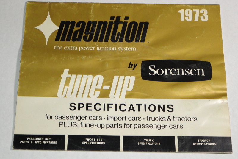 | 14339 | P. Sorensen Manufacturing Co., Inc. | 1973 Magnition Tune-Up Specifications | P. Sorensen Manufacturing Co., Inc. | Fair to good. Soiling on the covers. Both covers and pages are 'wavey,' but contents are very good. | 11 x 8.5 inches with tune-up instructions for cars, import cars, trucks & tractors and more. | Automotive, P. Sorensen Manufacturing Co., ephemera | $20 |