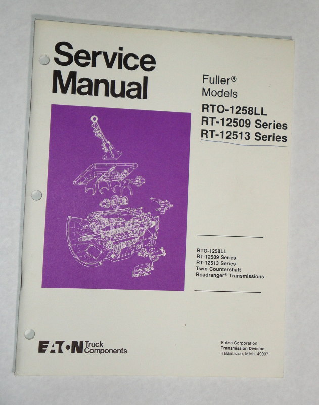 | 14340 | Eaton Corporation, Transmission Division | Service Manual Fuller Models RTO-1258LL, RT-12509 Series, RT-12513 Series | Eaton Corporation, Transmission Division | Very good. One ink underlining on the front cover. | 8.5 x 11 inches with many photos and illustrations of Eaton Corporation Fuller transmissions. | Automotive, Eaton Corporatioin, Fuller transmissions | $25 |