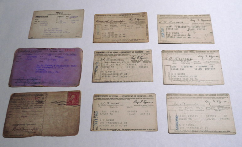 | 15361 | Pennsylvania Department of Revenue | Motor Vehicle Registrations - Nine vehicle registrations from 1918 to 1928 | Pennsylvania Deaprtment of Revenue | Good. Some are 'billfold' soiled and worn. | Pennsylvania car registrations from 1918. 'Certificate for ...the Pneumatic Tired Motor Vehicle Below Descibed.' (faded) . A 1920 Ford is registered in 1923. A 1922 Dodge truck is registered in 1924, 1925, 1926 and 1927. A 1927 Dodge sedan is registered in 1927 and 1928. | Automotive, ephemera | $40 |