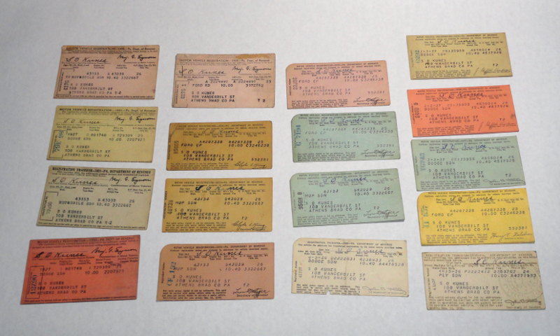 | 15363 | Pennsylvania Department of Revenue | Motor Vehicle Registrations - 15 vehicle registrations from 1940 to 1954 | Pennsylvania Deaprtment of Revenue | Good. Some are 'billfold' soiled and worn. | Pennsylvania car registrations from 1940 to 1954. Vehicles registered are a Dodge sedan and a Dodge Brougham? | Automotive, ephemera | $40 |