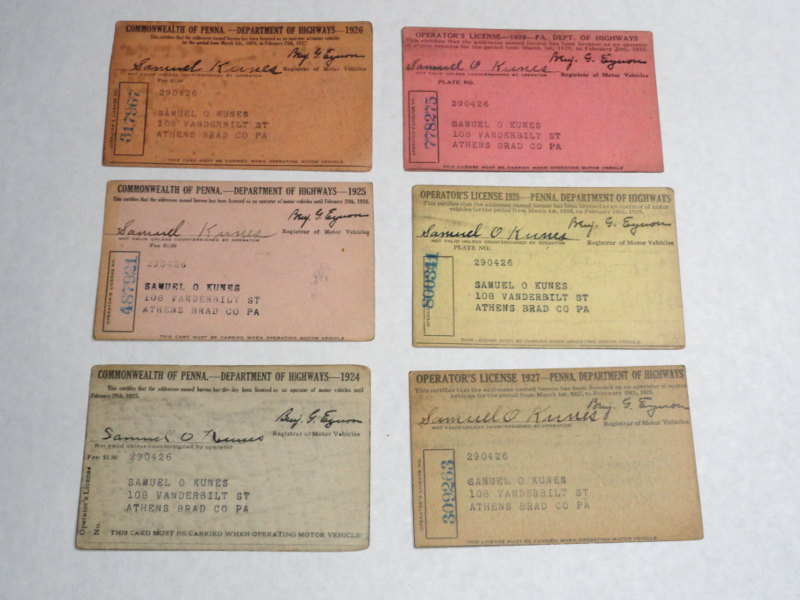 | 15369 | Commonwealth Of Pennsylvania Department Of Highways | Six Pennsylvania Driver's Licenses from the 1920s | Commonwealth Of Pennsylvania Department Of Highways | Good. Some billfold soiling and wear. | Pennsylvania driver's licenses. 1924, 1925, 1926, 1927, 1928 and 1929 | Automotive, Driver's licenses, Pennsylvania, ephemera | $20 |