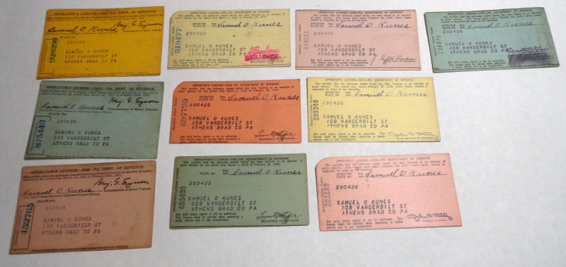 | 15370 | Pennsylvania Department of Revenue | Ten Pennsylvania Driver's Licenses from the 1930s | Pennsylvania Department of Revenue | Good. Some billfold soiling and wear. | Pennsylvania driver's licenses. 1930-1939. | Automotive, Driver's licenses, Pennsylvania, ephemera | $25 |
