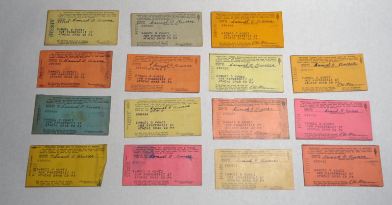 | 15371 | Pennsylvania Department of Revenue | Fifteen Pennsylvania Driver's Licenses from 1940 to 1953 | Pennsylvania Department of Revenue | Good. Some billfold soiling and wear. | Pennsylvania driver's licenses. 1940-1953. | Automotive, Driver's licenses, Pennsylvania, ephemera | $25 |