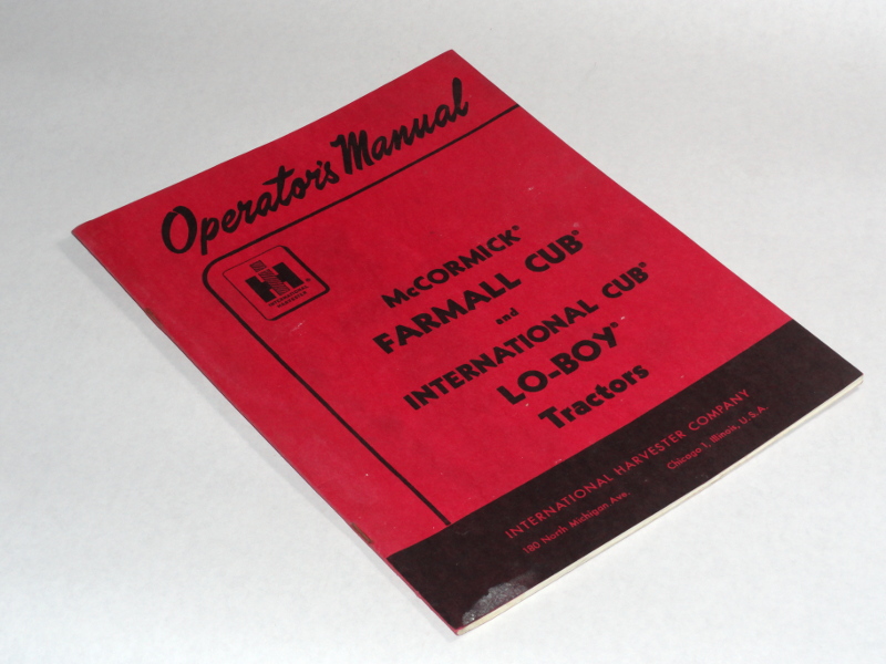 | 15606 | International Harvester Company | Operator's Manual McCormick Farmall Cub and International Cub Lo-Boy Tractors | International Harvester Company | Good. A little musty. Front cover has light staining. Faint vertical crease | Operator's Manual for McCormick Farmall Cub and international Cub Lo-boy with photos and typical information. | Agriculture, Automotive, International Harvester. | $20 |