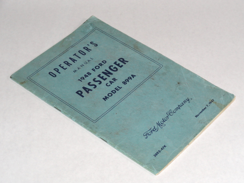 | 15646 | Ford Motor Company | Operator's Manual 1948 Ford Passenger Car Model 899A | Ford Motor Company | Good. Some spotting, creasing and soiling on the covers. First 4 pages have a small liquid stain on the bottom margins. | 5.75 x 8.75 inches with many diagrams and b&w photos, 1948 Ford Car manual. | Automotive, 1948 Ford | $20 |