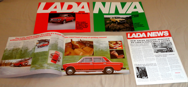 | 15834 | Lada Cars Of Canada Inc. | Lada 1500s, Niva literature | Lada Cars Of Canada Inc. | Good. Short tear on the back of one piece. | 8.5 x 11 inch literature for Lada cars in Canada. The Niva, the 1500s, another 8 page 1500s and a 1981 copy of Lada News. | Lada Cars, Canada, Automotive, ephemera | $25 |