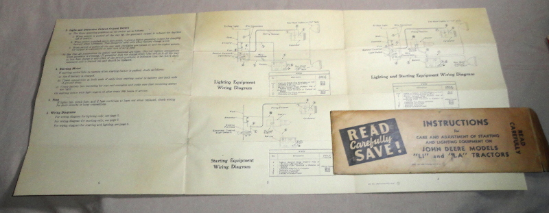 | 15890 | John Deere | Instructions for Care and Adjustment Of Starting And Lighting Equipment On John Deere Models "LI and "LA" Tractors | John Deere | Good. Greasy and a bit worn. | 26 x 11 inches 3 fold instruction sheet which is folded again 4 times to fit in an envelope, for John Deere LA lighting equipment. There's a parts list. | Agriculture, John Deere, John Deere LA, automotive | $30 |