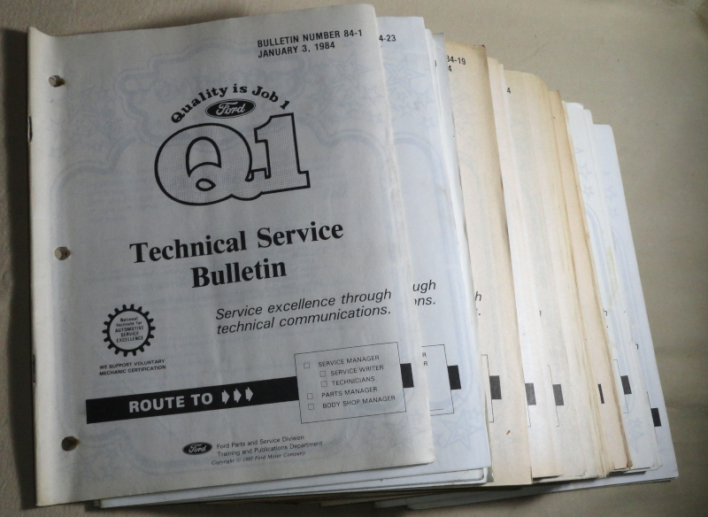 | 16049 | Ford | Technical Service Bulletin, Bulletin Number 84-1 to 84-24, 1984, a complete run | Ford Motor Company | Good. Rusty staples, soiling, some ink. | 8.5 x 11 inches with diagrams and information. | Automotive, Ford | $50 |