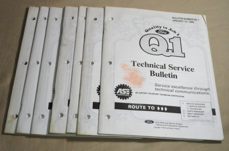 | 16050 | Ford | Technical Service Bulletin, Bulletin Number 85-1 to 85-7, 1985, 7 issues, a partial run. | Ford Motor Company | Good. Rusty staples, soiling, some ink. | 8.5 x 11 inches with diagrams and information. | Automotive, Ford | $20 |