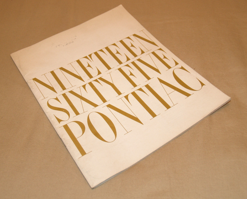 | 16200 | General Motors, Pontiac Division | Nineteen Sixty Five Pontiac | General Motors, Pontiac Division | Good. Front cover has an ink stain, back cover has a dealer stamp. | 8.5 x 10.5 inches, Artist renderings, color photos and specifications of 1965 Pontiac models. | Automotive, Pontiac, ephemera | $20 |