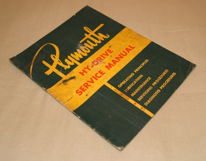 | 16202 | Chrysler Corporation | Plymouth Hy-Drive Service Manual | Chrysler Corporation | Fair. Front cover has grease and stains. Some soiling inside as well. | 8.5 x 11 inches. Service for the Plymouth Hy-Drive transmission with b&w photos and illustrations. | Automotive, Chrysler, Plymouth, Hy-drive transmission. | $20 |