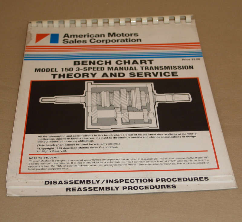 | 16303 | American Motors Sales Corporation | Bench Chart Model 150 3-speed Manual Transmission Theory And Service | American Motors | Good. Some soiling and stains. | 8.5 x 11 inches, comb binding, with a stand-up back and instructions on the model 150 3-speed transmission. | Automotive, American Motors, Model 150 3-speed transmission | $20 |