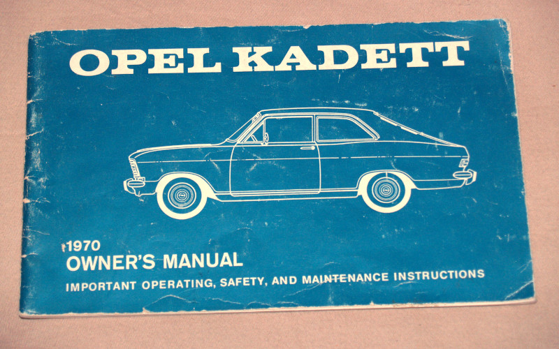 | 16594 | Buick Motor Division | Opel Kadett 1970 Owner's Manual | Buick Motor Division | Good. Both covers are worn and soiled. One page has writing. | 8.25 x 5 inches, with photos and illustrations. | Opel Kadett, Owner's Manual, automotive | $20 |