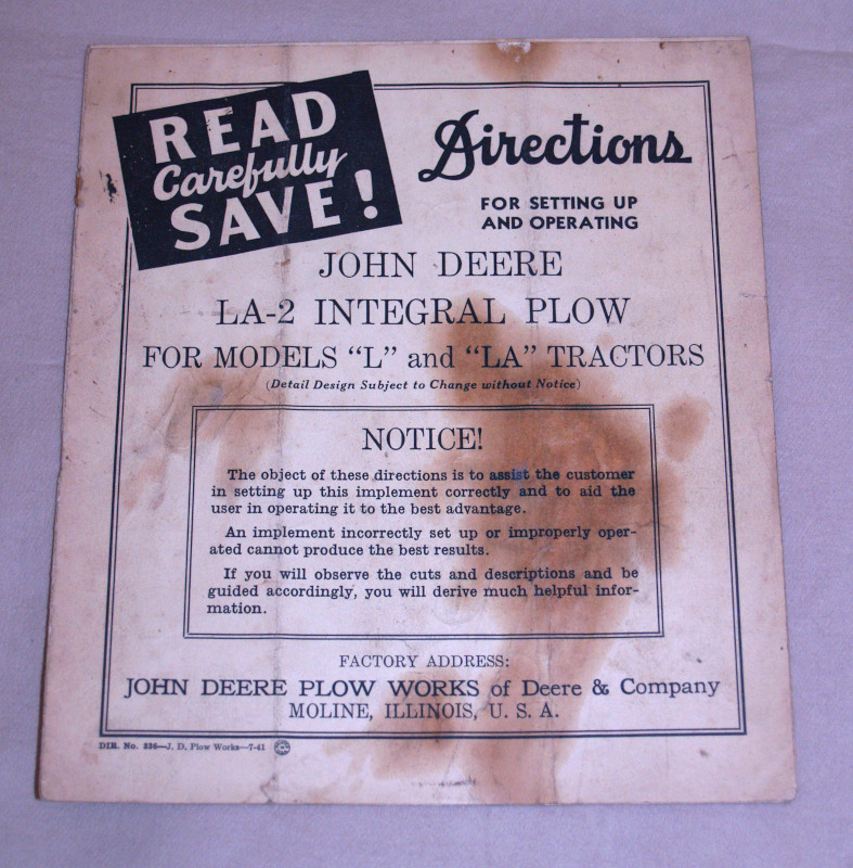 | 16623 | John Deere | Directions For Setting Up And Operating John Deere LA-2 Integral Plow For Models "L" and "LA" Tractors | John Deere | Fair. Soiling, creasing, stains, 2 pages have residue from something, rusty staples. | 8 x 9 inches, instructions for a plow for John Deere L and LA tractors. | Agriculture, John Deere, automotive | $30 |