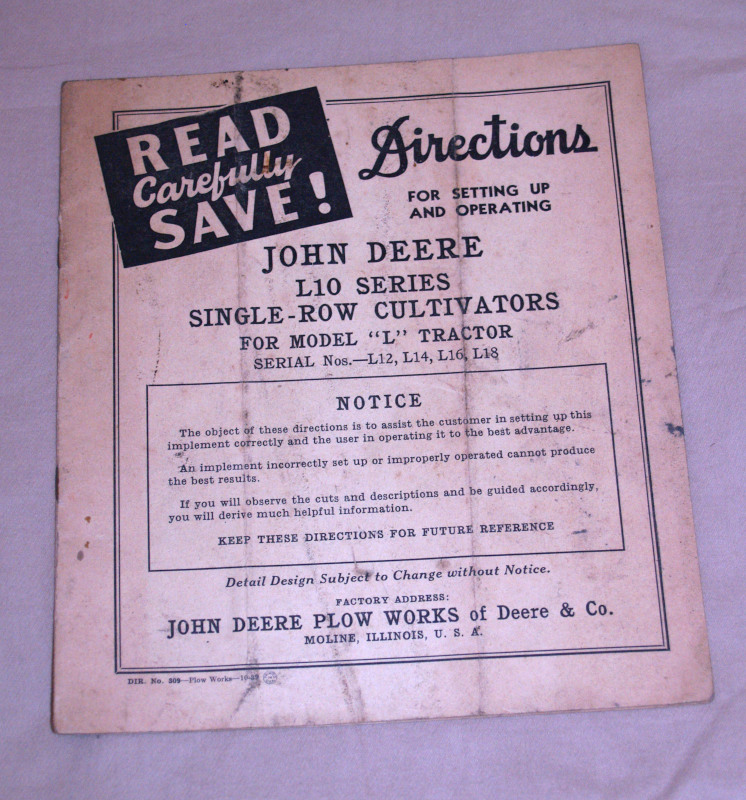 | 16625 | John Deere | Directions For Setting Up And Operating John Deere L10 Series Single-Row Cultivators For Model "L" Tractor | John Deere | Fair. Soiling, creasing, stains. | 8 x 9 inches, instructions for single row cultivators for John Deere L tractors. | Agriculture, John Deere, automotive | $30 |