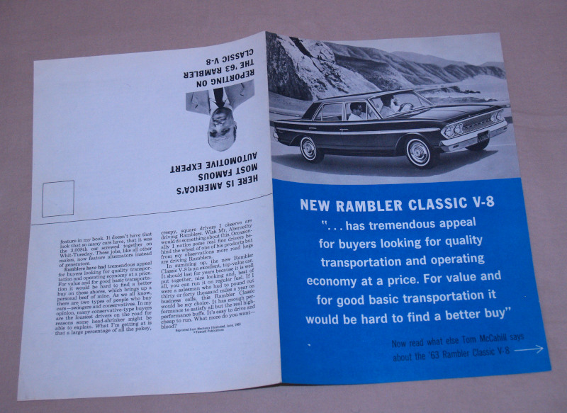 | 16703 | McCahill, Tom | The Rambler | American Motors | Very good. | 7 x 10 inch literature for the 1963 Rambler Classic V-8, a road test reprinted from Mechanix Illustrated. There are b&w photos. | Automotive, Tom McCahill, Rambler, ephemera, brochure | $20 |
