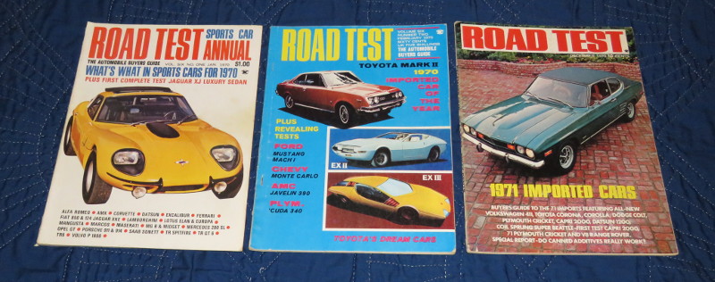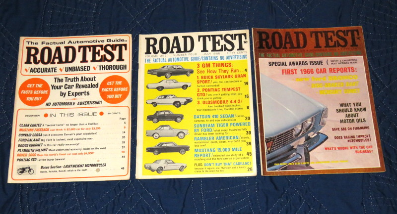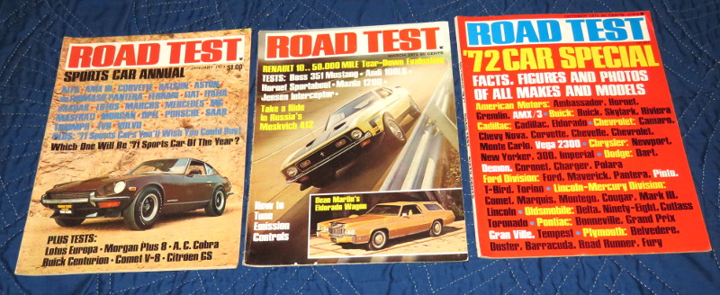 | 17176 | Road Test Staff | Road Test, 3 volumes: Volume 6, numbers 1, 2 and 12 | Road Test Magazine | Good. Staples are a little rusty. | 8 x 11 inches with b&w photos, automotive tests. Faintlly musty. | Automotive, Road Test | $20 |