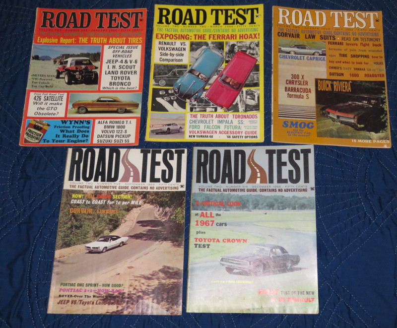 | 17173 | Road Test Staff | Road Test, 5 volumes: Volume 2, numbers 1, 2, 4, 5 and 6 | Road Test Magazine | Good. Staples are a little rusty. Faintly musty. | 8 x 11 inches with b&w photos, automotive tests. | Automotive, Road Test | $30 |