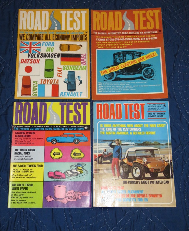 | 17174 | Road Test Staff | Road Test, 4 Volumes. Volume 3 numbers 1, 3 and 4, Volume 4 number 10 | Road Test Magazine | Good. Staples are a little rusty. Faintly musty. | 8 x 11 inches with b&w photos, automotive tests. | Automotive, Road Test | $20 |