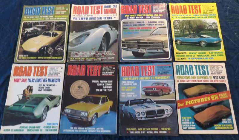 | 17175 | Road Test Staff | Road Test, 8 volumes: Volume 5, numbers 1, 2, 4, 5, 6, 7 and car of the year issue | Road Test Magazine | Good. Staples are a little rusty. | 8 x 11 inches with b&w photos, automotive tests. Faintly musty. | Automotive, Road Test | $30 |