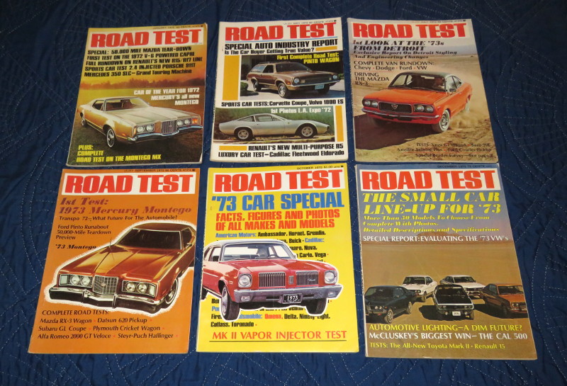 | 17178 | Road Test Staff | Road Test, 6 volumes: 1972, January, May, July, September, October and December | Road Test Magazine | Good. Staples are a little rusty. Faintly musty. | 8 x 11 inches with b&w photos, automotive tests. | Automotive, Road Test | $30 |