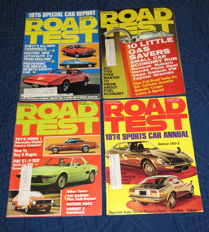 | 17180 | Road Test Staff | Road Test, 4 volumes: 1974, February, April, May and August | Road Test Magazine | Good. Staples are a little rusty. Faintly musty. | 8 x 11 inches with b&w photos, automotive tests. | Automotive, Road Test | $20 |