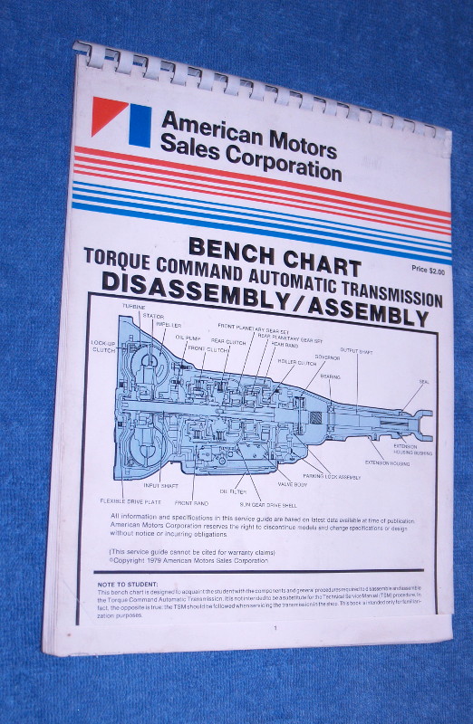 | 17354 | American Motors Sales Corporation | Bench Chart Torque Command Automatic Transmission Disassembly/Assembly | American Motors | Good. 1/2 inch cut from the bottom of the front cover. Light Shelf wear. | 8.5 x 11 inches in a comb binding with a cardboard support on the back. Black and white disassembly/assembly photos. | Automotive, American Motors, Torque Command Transmission. | $25 |